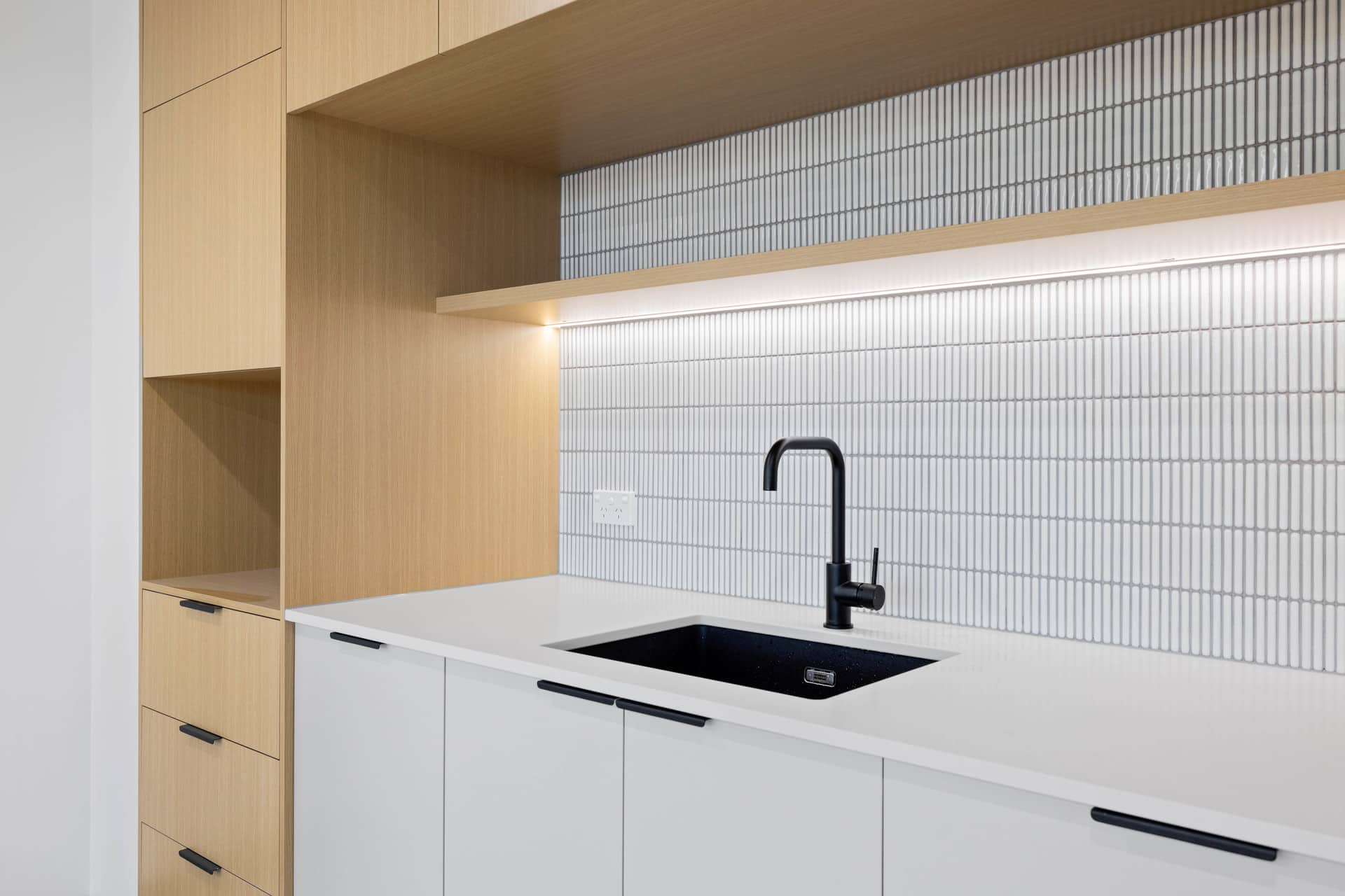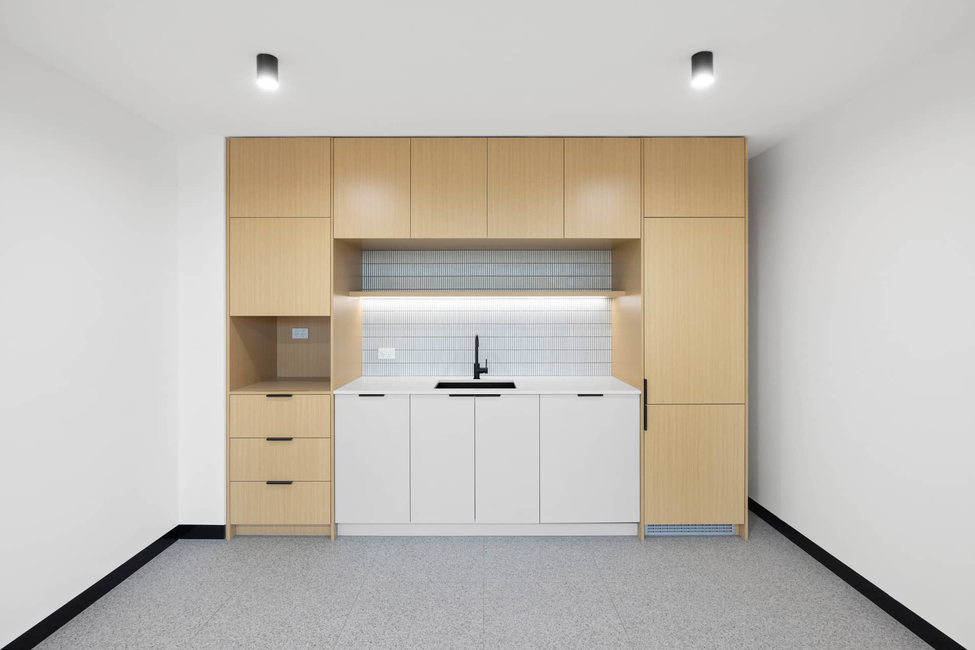 * Designer kitchenette with terrazzo-look porcelain tiles, 20mm stone benchtop & feature mosaic splashback